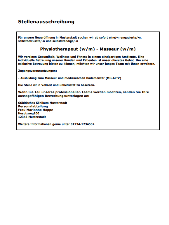 Die Musterbewerbung ist eine vorgefertigte, professionell formatierte Bewerbung für spezielle Berufe, die als Formatierungshilfe und Formulierungshilfe für ein Bewerbungsschreiben, den Lebenslauf und andere Dokumente dient. Sie kann besonders für den Karrierestart oder für den Berufswechsel eine große Hilfe sein, da sie für eine vollständige und optisch ansprechende Bewerbung sorgt. Da Personalarbeiter, die mit der Sichtung und Sortierung von Bewerbungsschreiben vertraut sind, auch mit Musterbewerbungen vertraut sind, sollte die Musterbewerbung allerdings nicht das eigenständige Verfassen eines Bewerbungsschreibens mit der Betonung individueller Stärken und des Interesses am Unternehmen ersetzen. Wird das Bewerbungsschreiben nur um die persönlichen Informationen ergänzt, so kann dieses im besten Fall nicht positiv aus der Masse der Bewerbungen herausstechen und erweckt im schlechtesten Fall den Eindruck von Desinteresse oder Faulheit. Besonders bei modernen Berufsfeldern und Start-ups kann es außerdem sinnvoll sein, das professionelle Format aufzulockern und mit einer individuellen Note zu versehen.